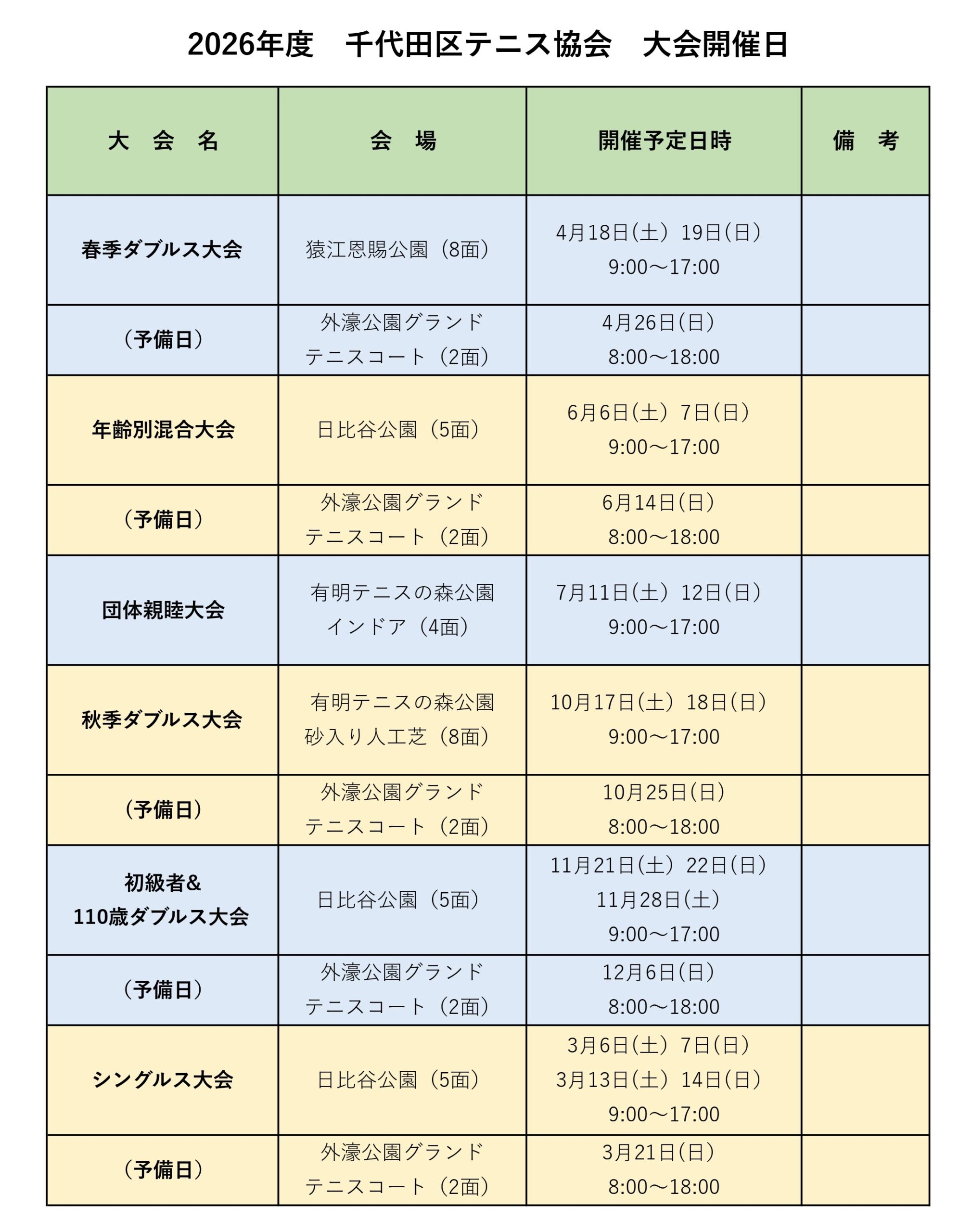 2026年度 大会等の年間事業予定について 2026 2/19 大会情報 2026年2月19日 2026年度の年間行事予定は以下のとおりです。 事業予定表PDF表示・ダウンロード 大会情報 よかったらシェアしてね! URLをコピーしました! ドロー表掲載:2026年3月シングルス大会@日比谷公園