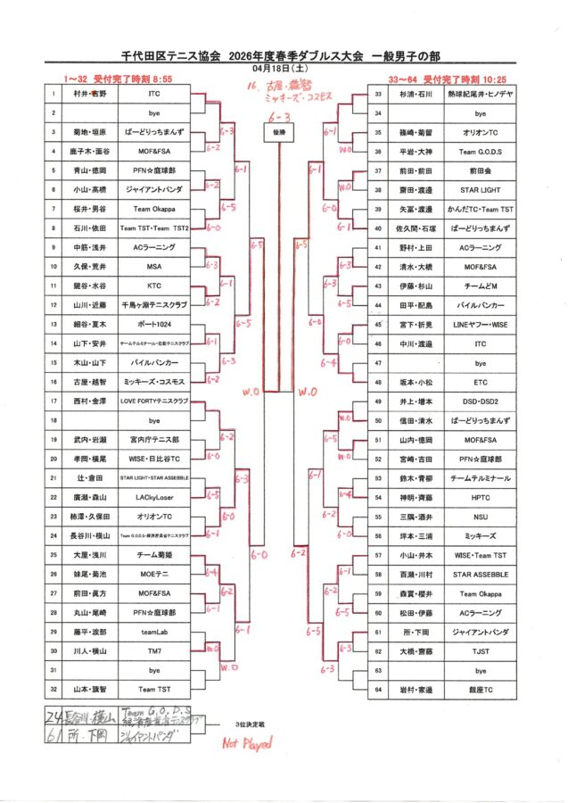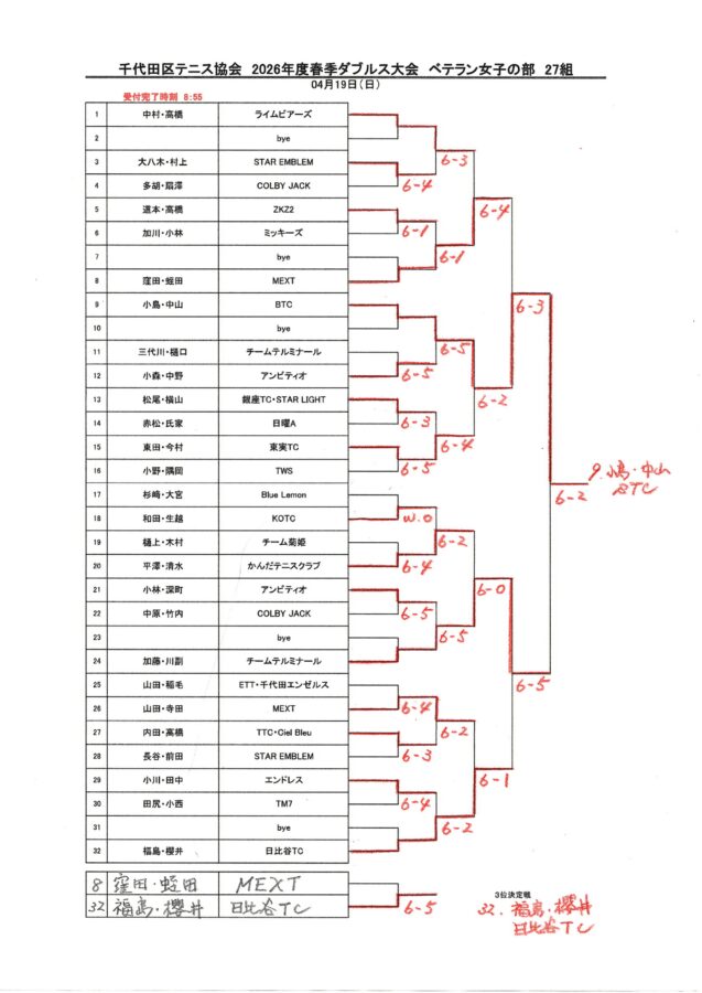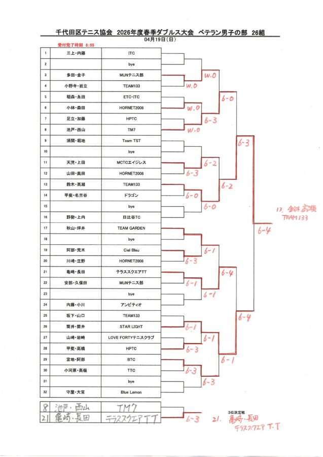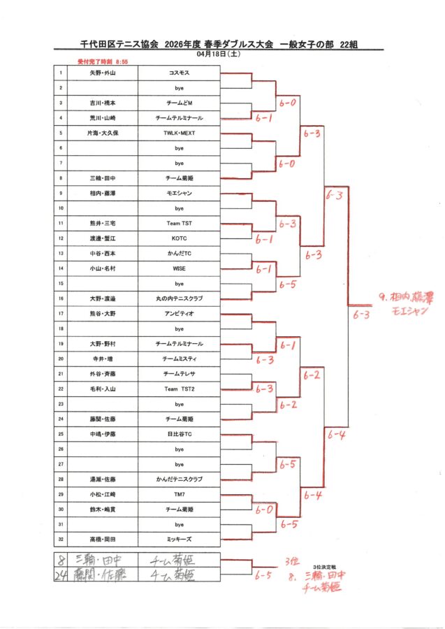 2026年 千代田区春季ダブルステニス大会 結果と表彰者